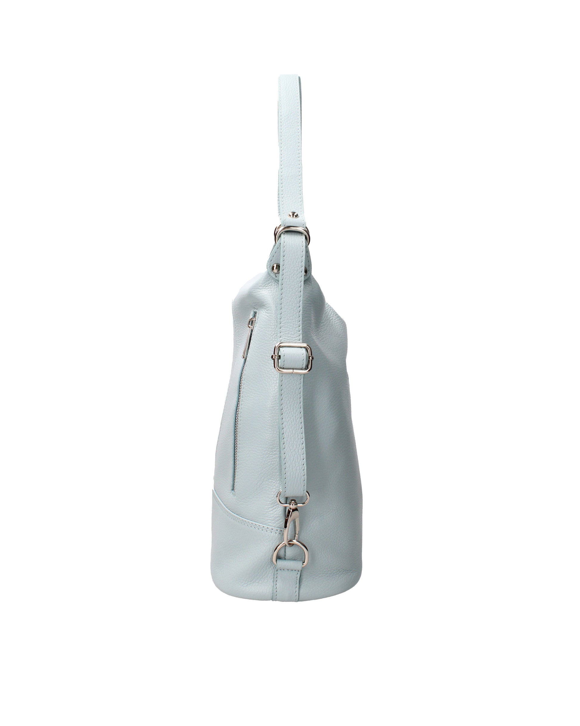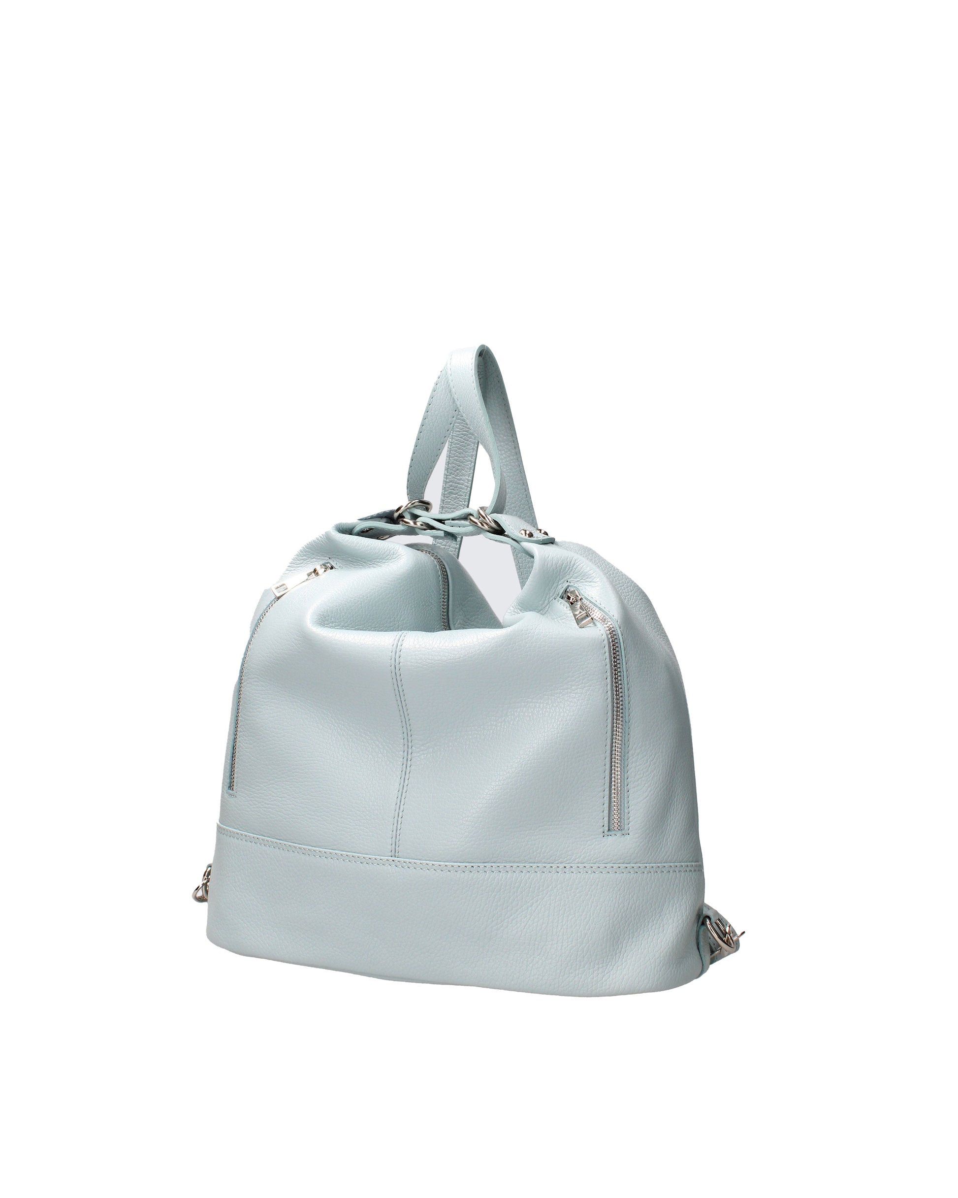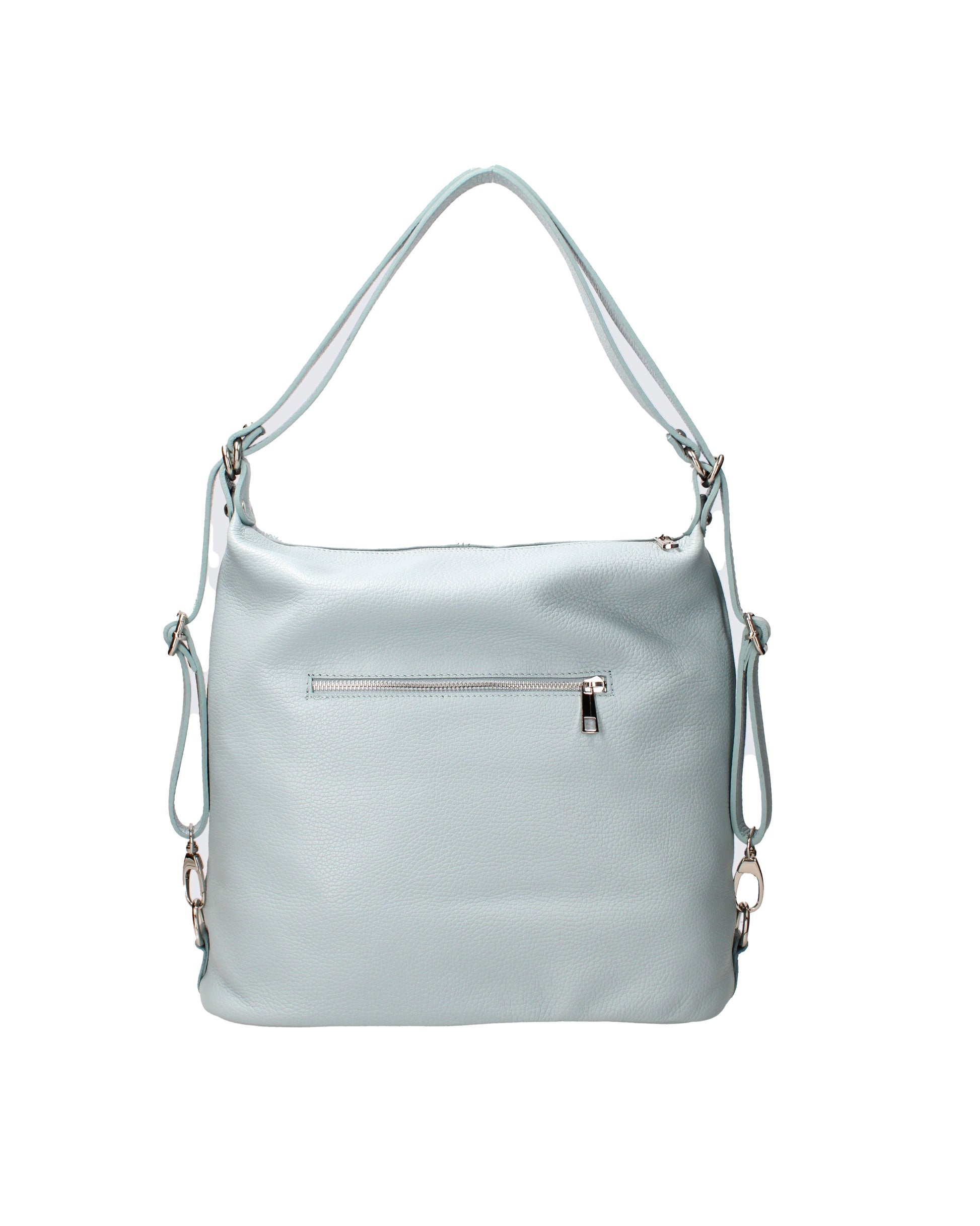 Borsa a spalla convertibile in zaino da donna. La chiusura è con zip. Le tasche interne sono una con zip e due aperte. Le tasche esterne sono due anteriori con zip e due posteriori con zip. La tracolla è regolabile in pelle . Il manico è regolabile in pelle . Gli scomparti interni sono uno. Il materiale esterno è vera pelle dollaro. Internamente è foderato in tessuto 70% cotone - 30% poliestere. Misure: . Made in Italy